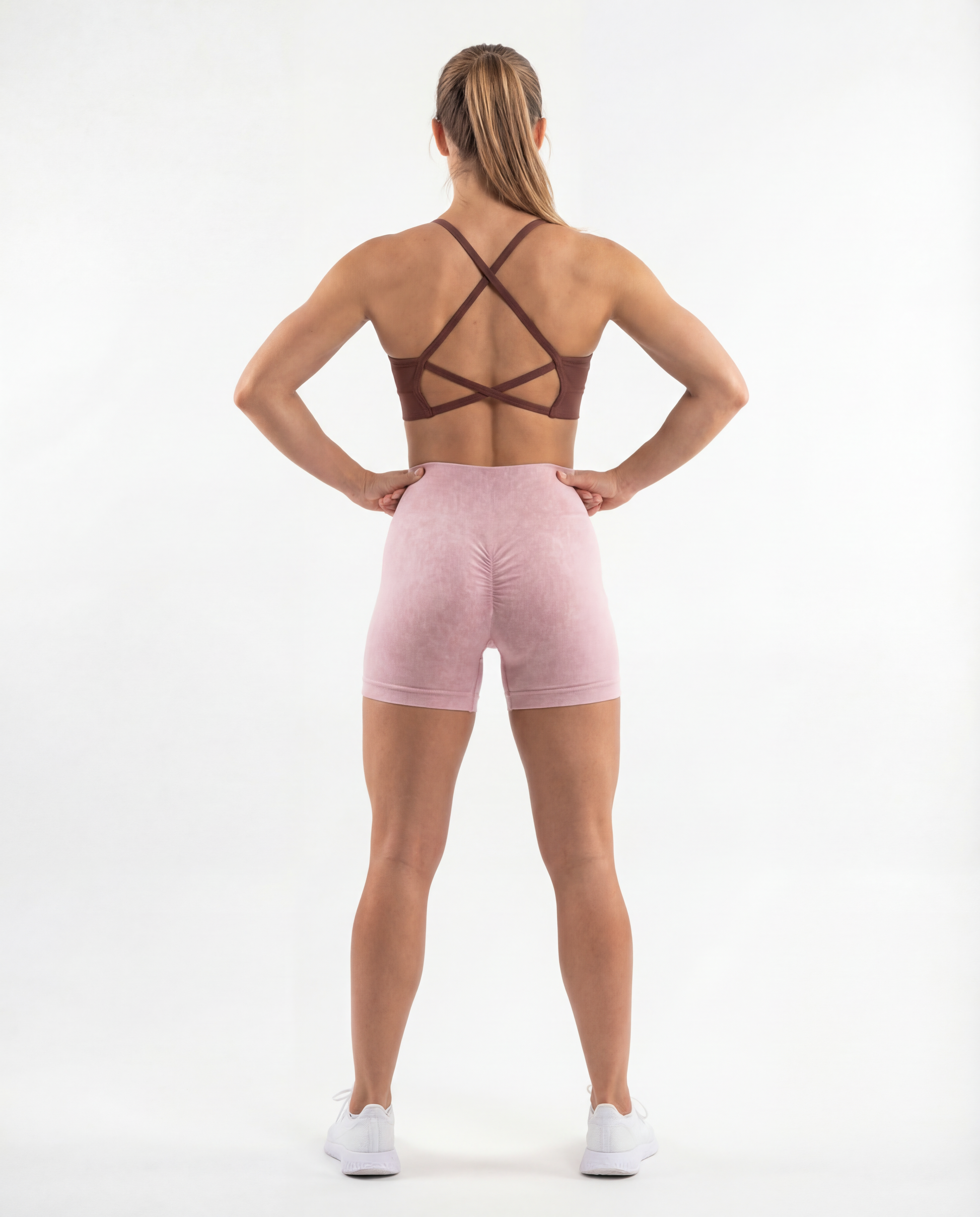 Pink against earth. Aura refuses expected coordination, pairing blush with warm brown in deliberate opposition. Scrunch construction meets seamless smoothness: texture where the body demands it, restraint where it doesn't. A set that trusts your eye over any formula, designed for those who approach style as instinct rather than instruction.