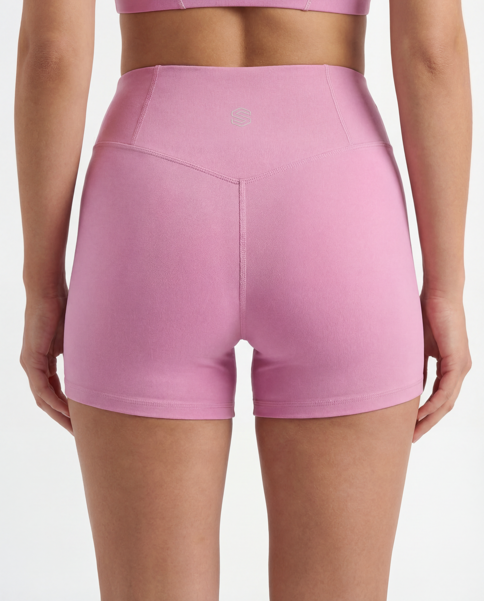 Tonal harmony with purpose. Bloom unites crop and shorts in soft pink, unified by white trim that traces the body's key lines. The set reads as singular rather than separate, eliminating choice while maximizing versatility. Breathable fabric manages moisture without sacrificing structure, while the high waist stays secure through varied intensity.